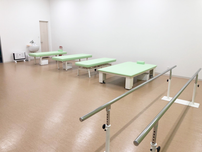 広いリハビリスペースにてスタッフと一緒にリハビリテーションを行い、痛みや可動域の改善、早い日常生活への回復を目指していきましょう。